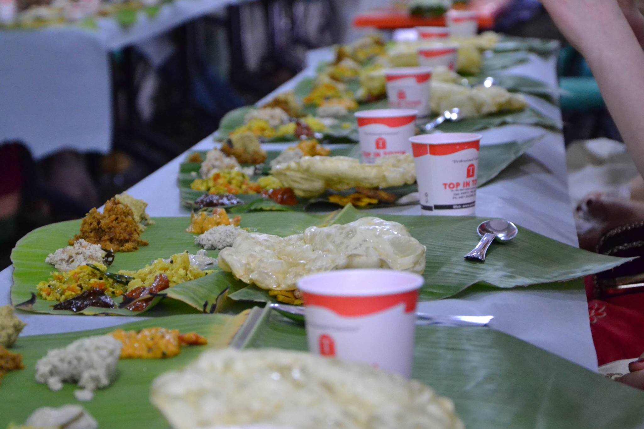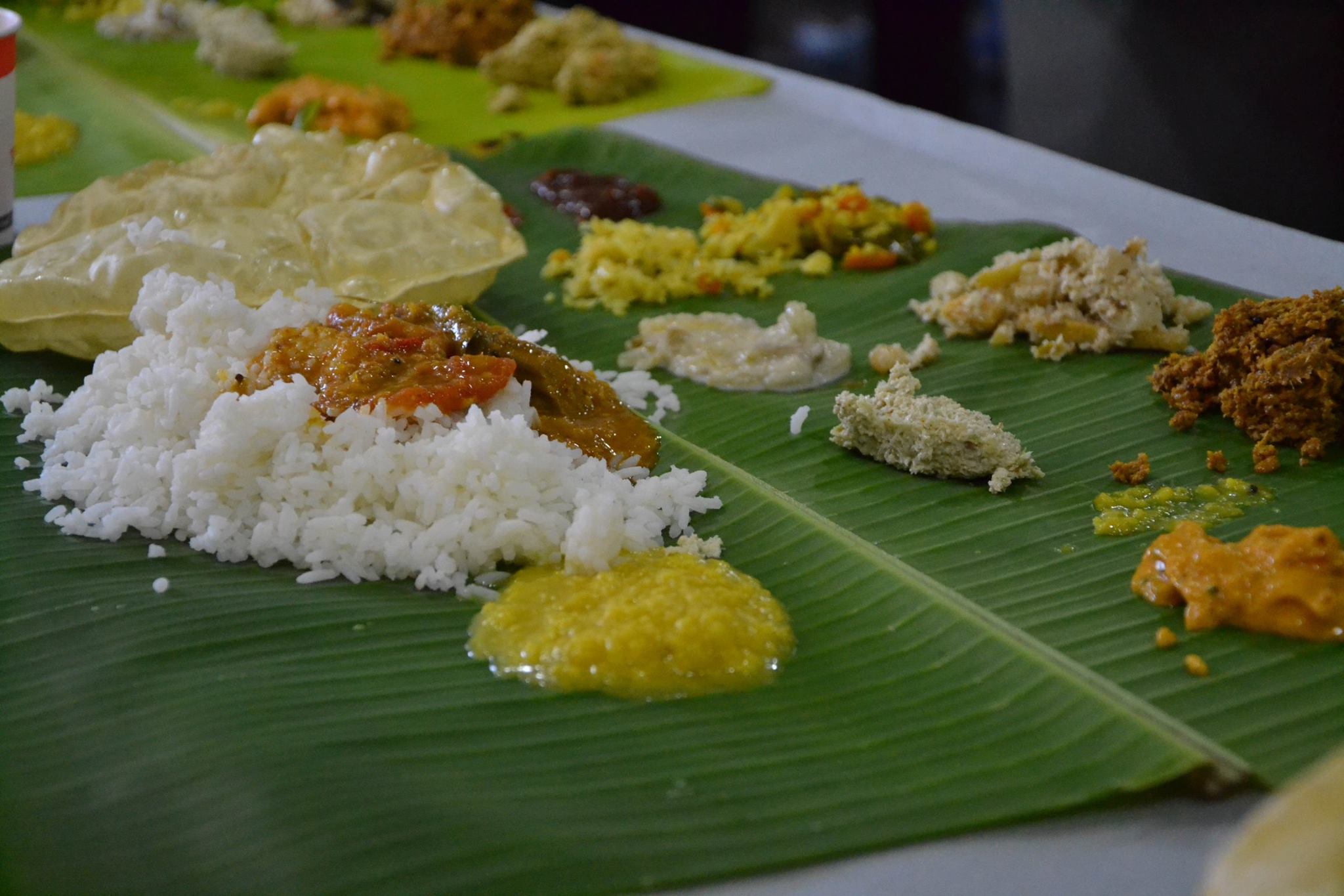 Dimineața nunții a fost, evident, foarte agitată cu îmbrăcatul saree-ului și n-am apucat să mai mănânc. Pe la ora 13:00, când am hotărât că am văzut destul de multe poze, am plecat spre sala de mese.  Înfometată cum eram am plecat spre masă fără camera foto, fără telefon, doar eu și saree-ul 🙂 Deci all credits go to Cristina Câmpian pentru pozele următoare. Masa tradițională de nuntă constă în servirea mâncării pe frunză de bananier. Iar mâncarea este un fel de all you can eat de orez și diverse tipuri de sosuri (mai mult sau mai puțin picante) pe baza de nucă de cocos, curry, mango etc. + niște sosuri dulci pe post de desert.