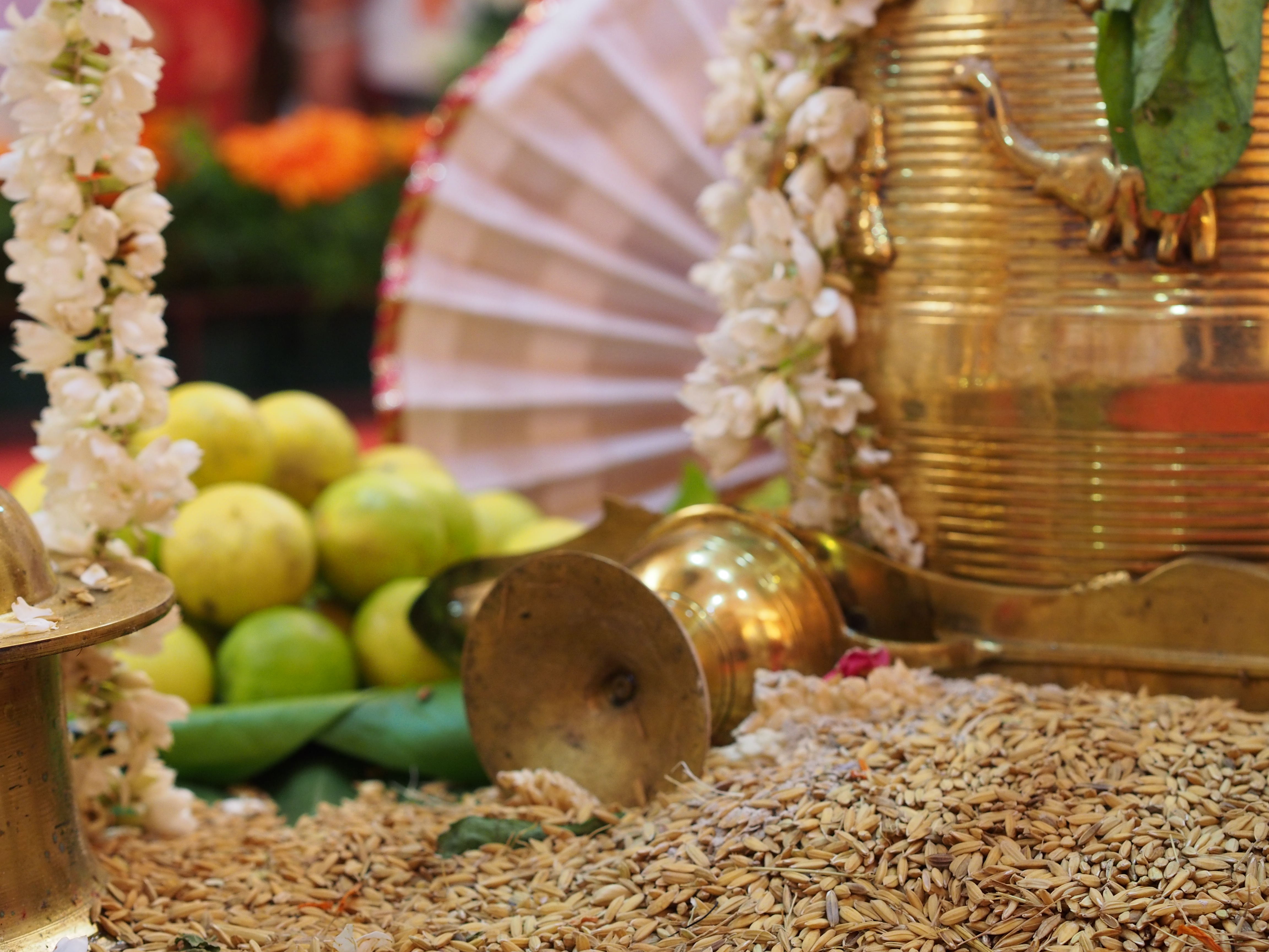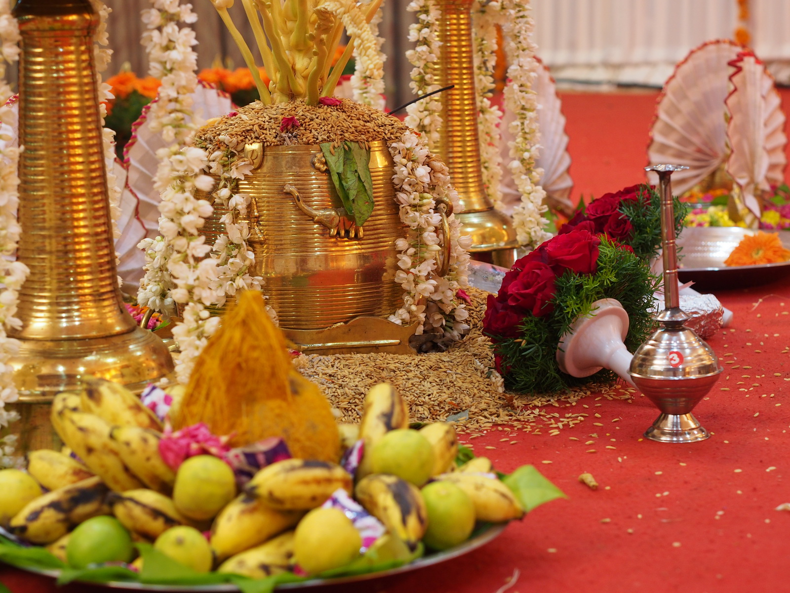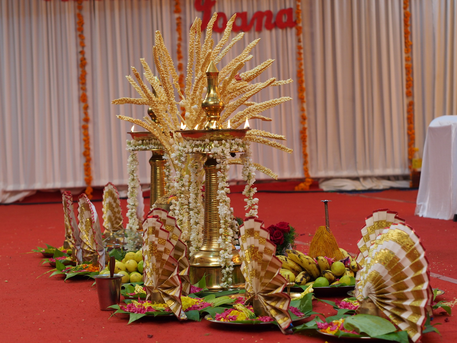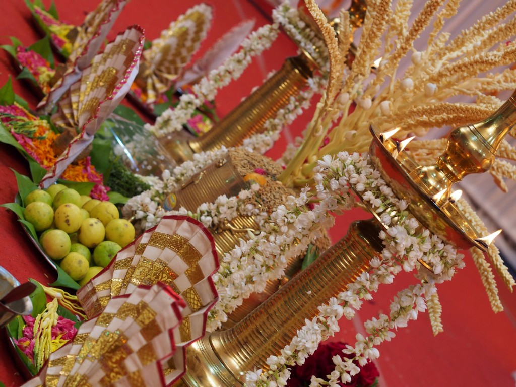 Scena pentru ceremonia oficială (kalyana mandap) – decorată cu flori de cocotieri, fructe și orez ce semnifică prosperitatea viitoarei familii